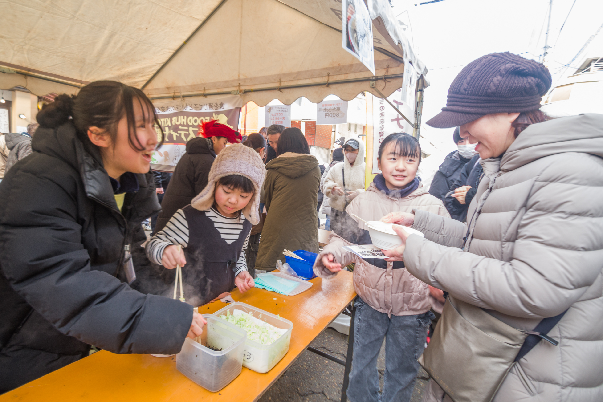 最初は緊張気味の子どもたち『いらっしゃいませ』『美味しい寒鱈汁はいかがですか?』とお客さんの呼び込みをしたり。お椀にアツアツの寒鱈汁を盛り付け、葱、岩のりを乗せたり、お会計のおつりの計算をしたりと。販売することの大変さと楽しさをみんなで学びました。