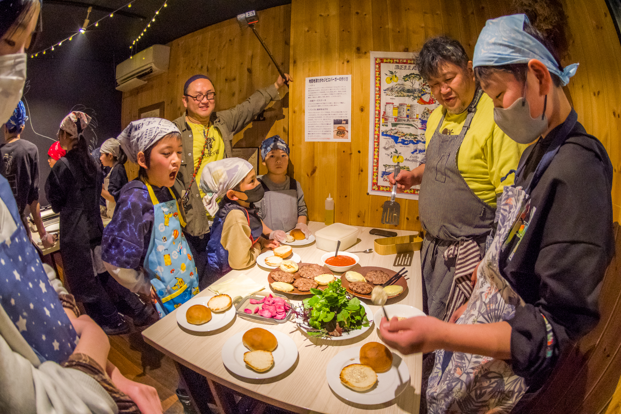親御さんたちは中に入れる、田川カブを切ったり、フライドポテトのじゃがいもを切ったり。食材が揃ったところで思い思いに挟んでいく。鶴岡を丸ごと挟んでいく。